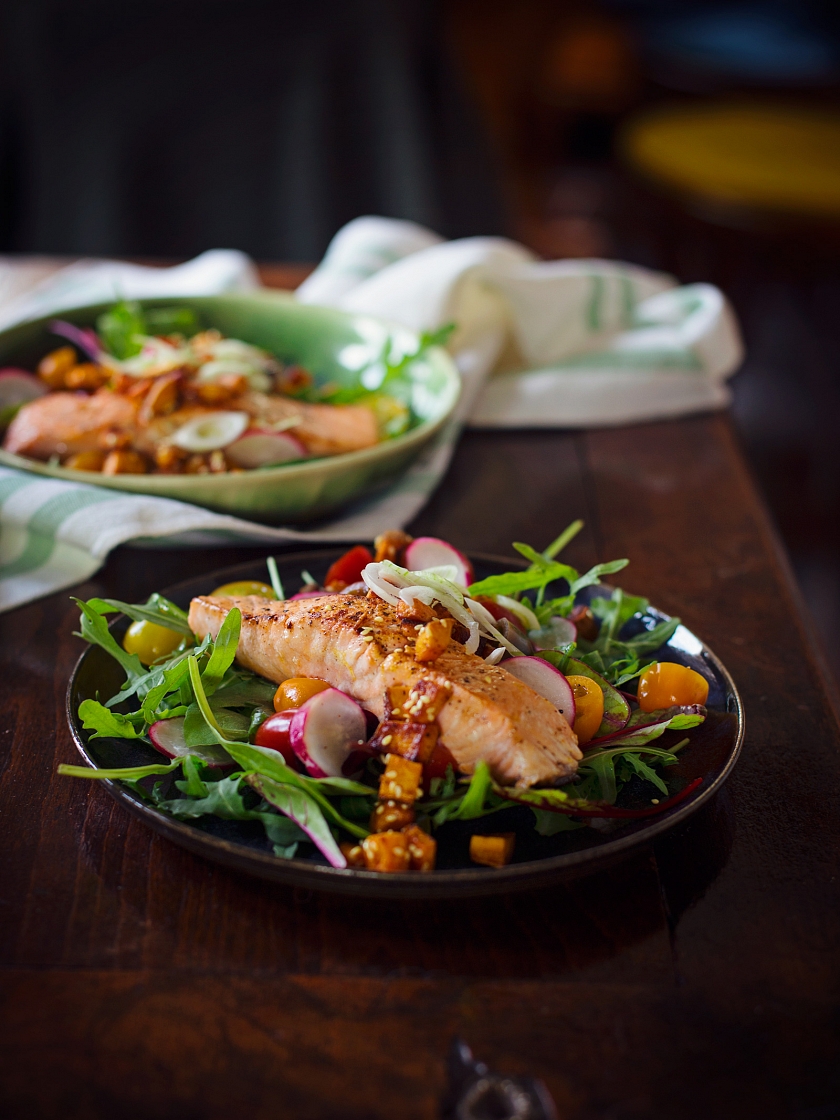 SALÁT S BATÁTOVÝMI KRUTONY A LOSOSEM